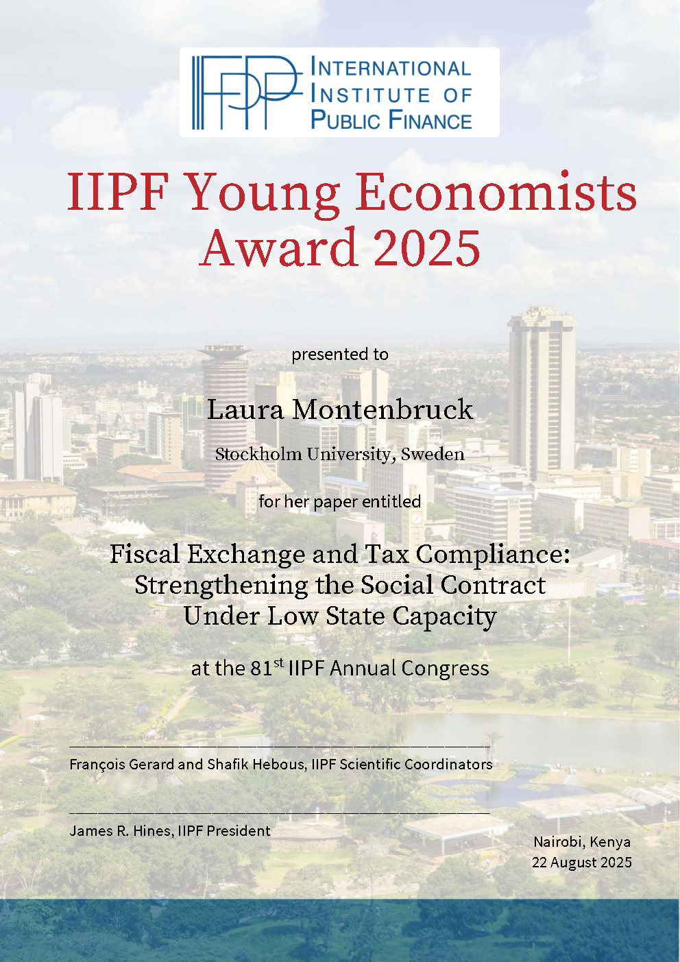 Laura Montenbruck (Stockholm University) for her paper "Fiscal Exchange and Tax Compliance: Strengthening the Social Contract Under Low State Capacity." | ![]() |