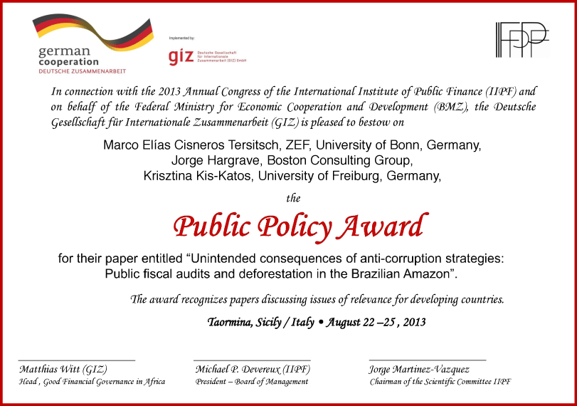 Marco Elías Cisneros Tersitsch (University of Bonn, Germany), Jorge Hargrave (Boston Consulting Group, Brazil), and Krisztina Kis-Katos(University of Freiburg, Germany) for their paper Unintended consequences of anti-corruption strategies: Public fiscal audits and deforestation in the Brazilian Amazon. |