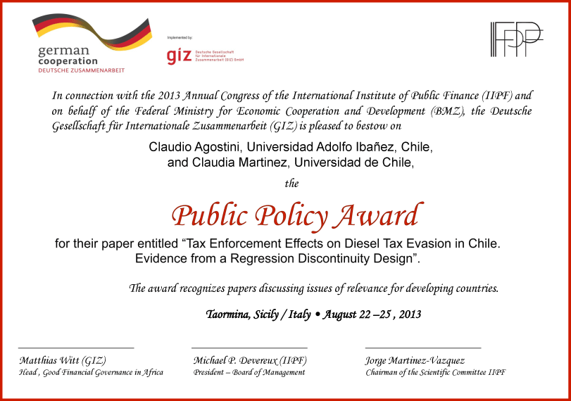 Claudio Agostini (Universidad Adolfo Ibañez, Chile) and Claudia Martinez (Universidad de Chile) for their paper Tax Enforcement Effects on Diesel Tax Evasion in Chile. Evidence from a Regression Discontinuity Design. | ![]() |